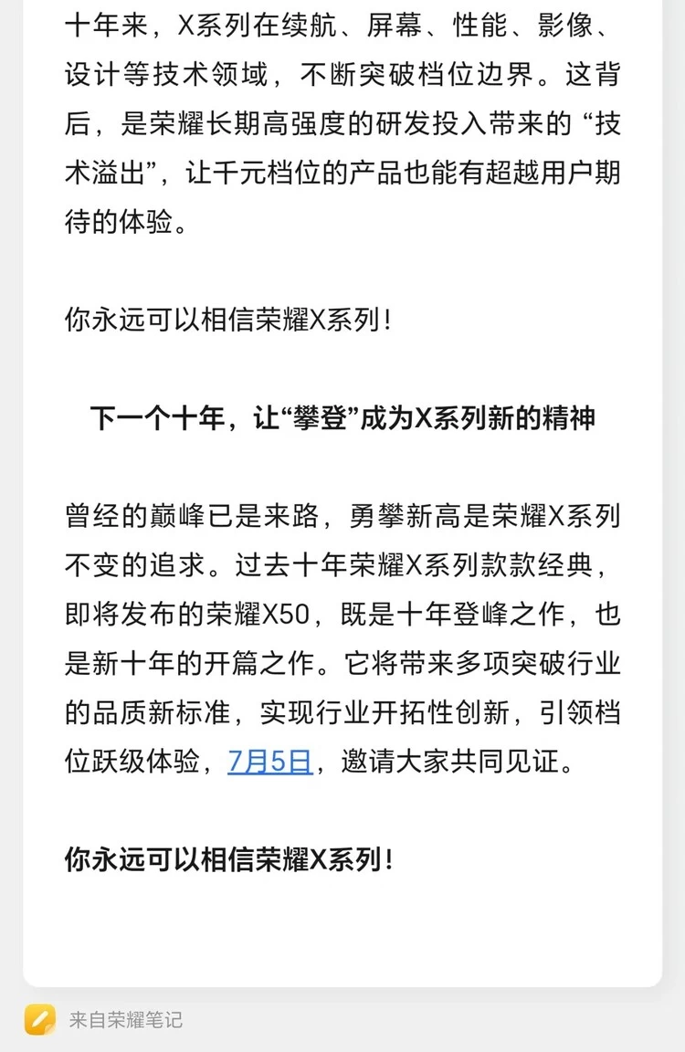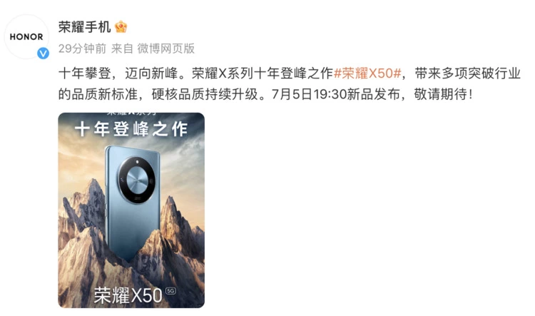 6月25日,荣耀官宣荣耀X50新品发布会将于7月5日19:30举行,并同步发起十周年老用户故事征集活动。