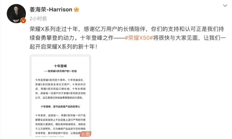 荣耀中国区CMO姜海荣发“X系列十年”长信 新品荣耀X50将于7月5日发布