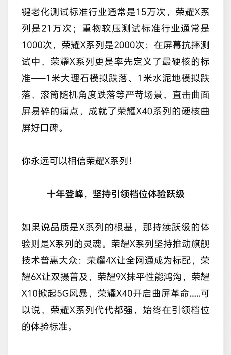 “你永远可以相信荣耀X系列!“,姜海荣在长信中表示,“荣耀始终坚持用远超行业的严苛标准来验证产品品质,荣耀X系列每一代产品都要在实验室的上千台设备上进行严苛的可靠性和耐久度测试,模拟各种极端情况,消耗成千上万部样机,只为确保产品品质不仅经得起市场考验,更对得起用户信任,让高品质成为荣耀X系列永不磨灭的标签”。