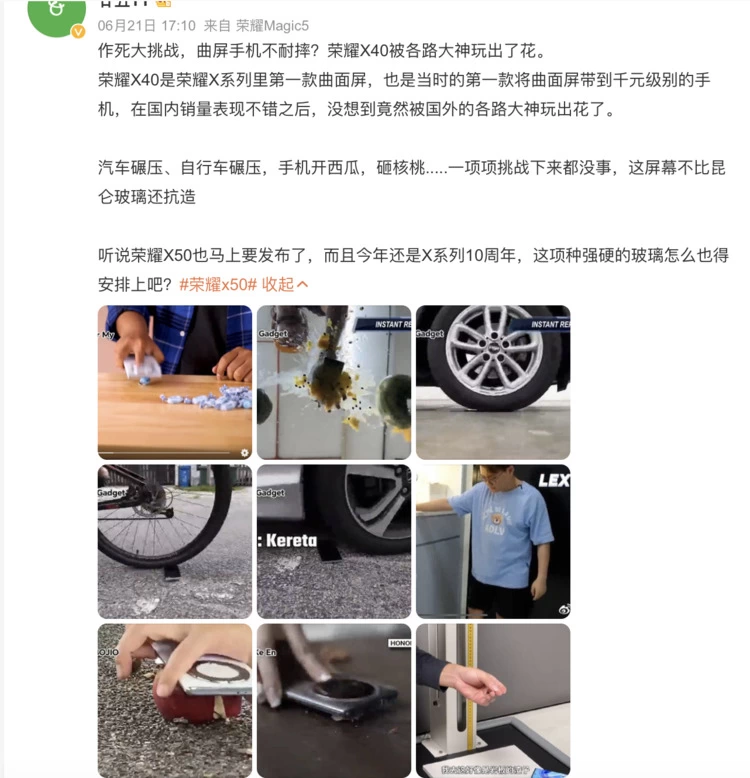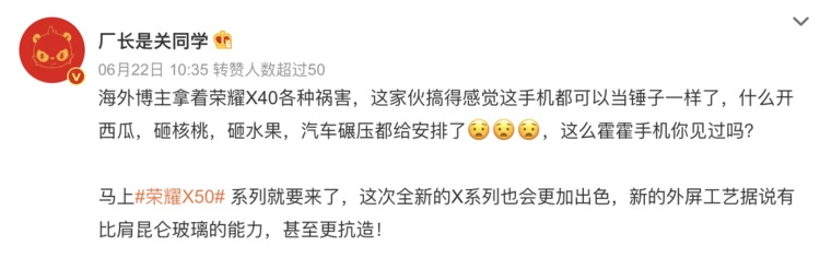 与之呼应的是,有博主透露,荣耀X40全球热销,在海外品质口碑爆棚,特别是老外的各种花式摔机视频刷屏,这也让网友对新品荣耀X50的期待值拉满。不少网友喊话姜海荣,这位多次以“摔”来验证荣耀产品力的高管,是不是在发布会上还将“现场摔机”,以此来印证荣耀手机在品质层面的严苛与自信。
