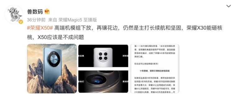 此外,还有博主表示,荣耀X50是“高端机模组下放,再镶花边,仍然是主打长续航和坚固”,表达了对新机续航和品质的期待。