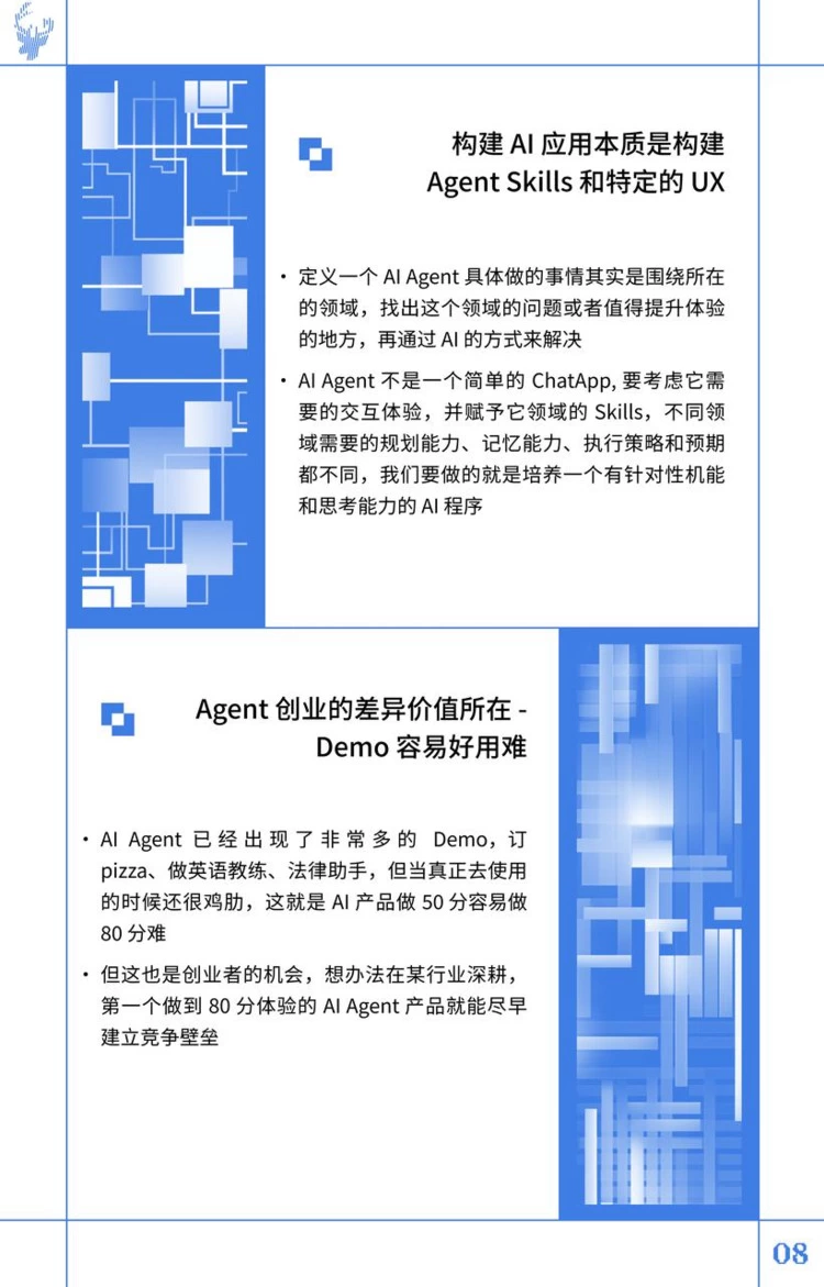 AI Agent 在 LLM OS 时代的簇拥下应运而生,它基于 LLM 的通用推理能力实现规划能力、记忆能力、工具使用能力和执行能力的一体化。一些 “垂类 AI 模型” 其实应该被定义为 “垂类 AI Agent”,实质是在 LLM 基础上定义领域行为、解决领域问题。而构建 AI Agent 的关键也在于培养 Agent 的专业技能并提升用户交互体验,为 Agent 赋予特定领域所需的规划、记忆、执行策略等能力。截至目前,尽管许多 AI Agent 的 Demo 如订餐、英语教练已出现,但真正使用时仍有巨大改进空间。这正是创业者的机会,通过深耕某行业,实现高品质 AI Agent,从而建立竞争壁垒。