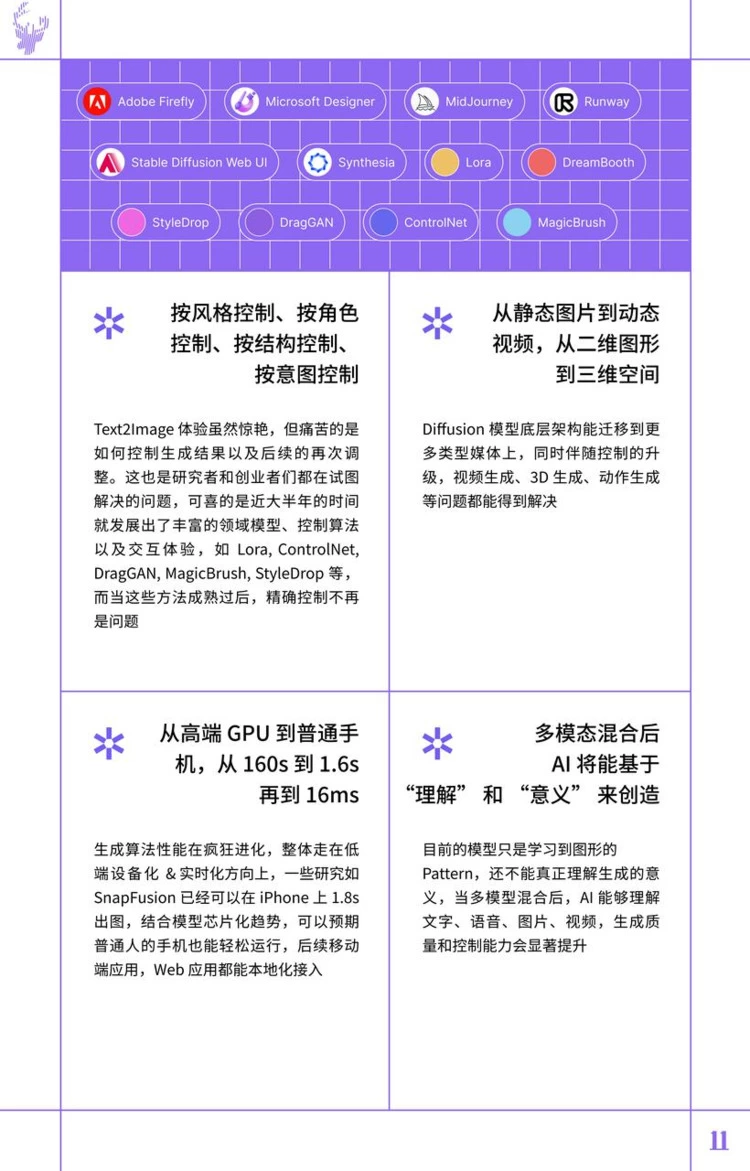 随着人工智能突飞猛进的发展,Text2Image 实现图片与文本的简单交互已不能满足需求,按风格、角色、结构、意图等实现文生图/图生图的更精准控制已经逐步被实现。其发展已经从静态到动态、二维到三维、高端 GPU 到人手一只的普通手机,Diffusion Model 的进化也将带来创造力的升级。在不久的将来,多模态混合将让 AI 能基于“理解”与“意义”创造,不仅学习图形,还能理解文本、语音、图像、视频,提升生成质量和控制能力,真正赋能人们的生产劳动过程。