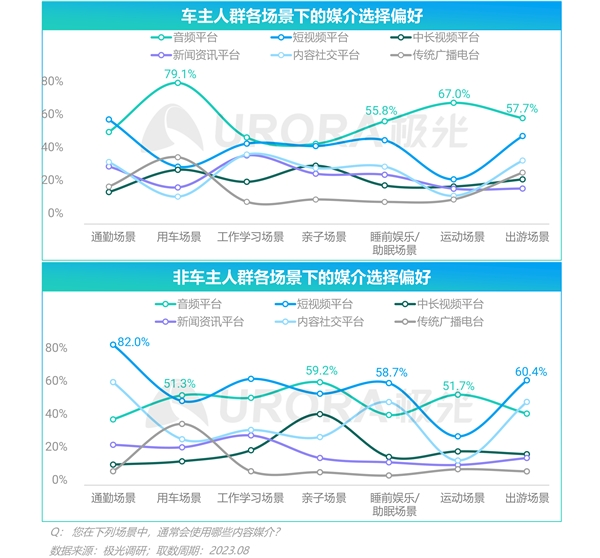 • 对比非车主人群,车主人群在多个生活场景下更偏好使用音频平台,如在用车场景、睡前娱乐/助眠场景和出游场景,音频平台在车主中的偏好占比均高于短视频等媒介平台