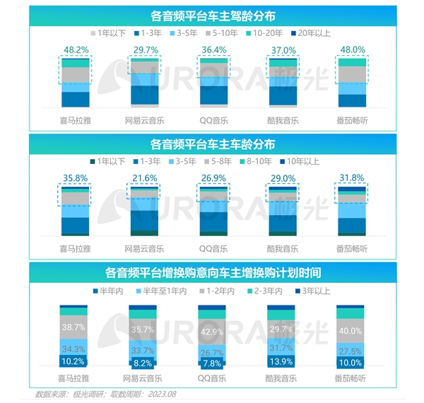 • 在预期增换购时间上,83.2%的喜马拉雅增换购意向车主计划在两年内完成增换购,网易云音乐为77.6%,番茄畅听为77.5%