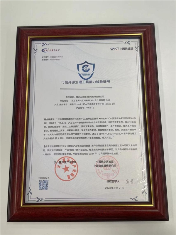 9月21日,中国信息通信研究院(以下简称“中国信通院”)、中国通信标准化协会联合主办的2023 OSCAR开源产业大会在京召开,会上发布了2023可信开源最新评估结果。其中,腾讯Xcheck-SCA开源威胁管控平台通过了可信开源治理工具评估。继去年通过静态应用程序安全测试(SAST)工具能力要求评估之后,XCheck再次获得了信通院权威认可。