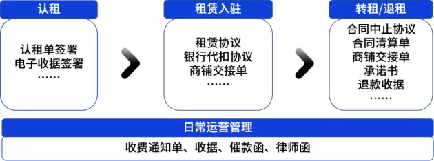 签署场景多,包含新签转让退租等场景,各个场景需要签署的文档众多,新签至少需要签署租赁协议、物业服务协议、银行自动转账授权书等;转让退租至少需要签署合同中止协议、合同清算单、商铺交接单、承诺书、退款收据等;