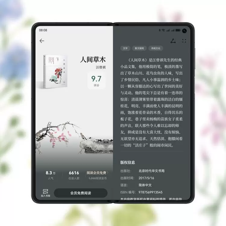 此外,华为MateX5内外屏都支持1440Hz PWM高频调光,让亮度的变化变得十分柔和,避免灯光调整的闪烁情况,不刺眼更温和。机身设计上,四曲面设计带来出色的手感,圆润不割手,让阅读时的握持感更舒适。打开华为阅读,挑选一本精心打造的“精品书”,不仅有多种还原真实纸品质感的内页,还能搭配定制主题背景,每一本书籍都有专属书封、微动效、艺术美感字体、精装排版,在手机上就能享受极致的设计之美。
