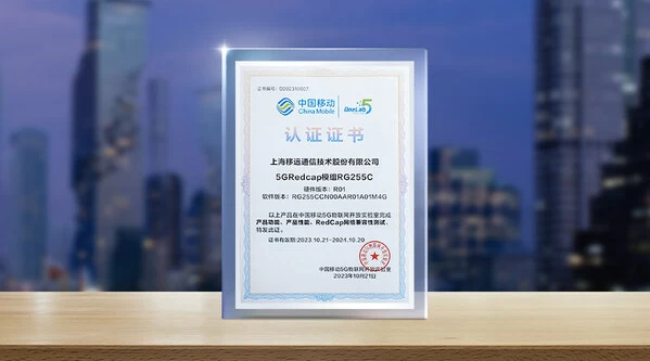 移远通信5G RedCap模组RG255C获中国移动5G物联网开放实验室5G及轻量化行业产品能力认证成果证书