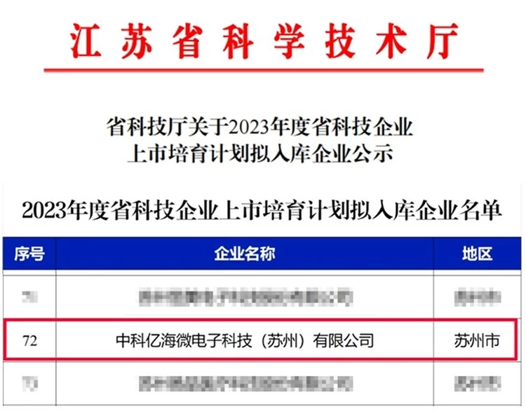 2023年10月30日,江苏省科技厅对2023年度省科技企业上市培育计划拟入库企业进行公示,苏州市吴中区6家企业入围,中科亿海微实力上榜。