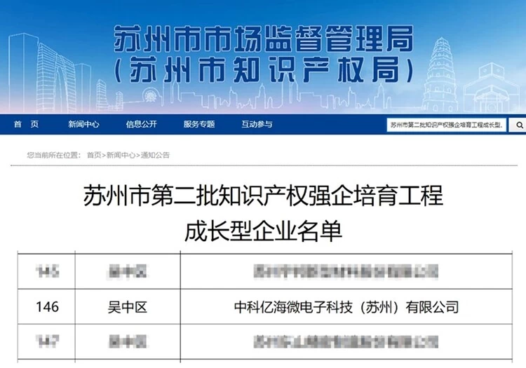 2023年4月20日,苏州市市场监督管理局(苏州市知识产权局)在苏州市第二批知识产权强企培育工程成长型、优势型、引领型企业名单中公示中科亿海微荣登《苏州市第二批知识产权强企培育工程成长型企业名单》。