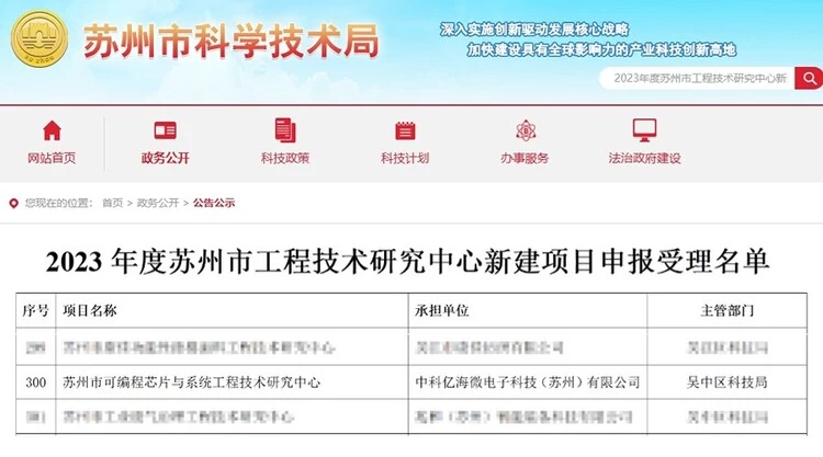 2023年10月31日,苏州市科学技术局公示了《2023年度苏州市工程技术研究中心新建项目申报受理名单》,中科亿海微成功入选。