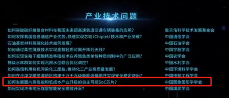 2023年10月22日,在第二十五届中国科协年会主论坛上,中国科协隆重发布2023重大科学问题、工程技术难题和产业技术问题。由中国图象图形学学会推荐,中科亿海微提交的《如何发展面向高性能和低成本产业升级的自主可控SoC芯片》成功入选2023年度十大产业技术问题。
