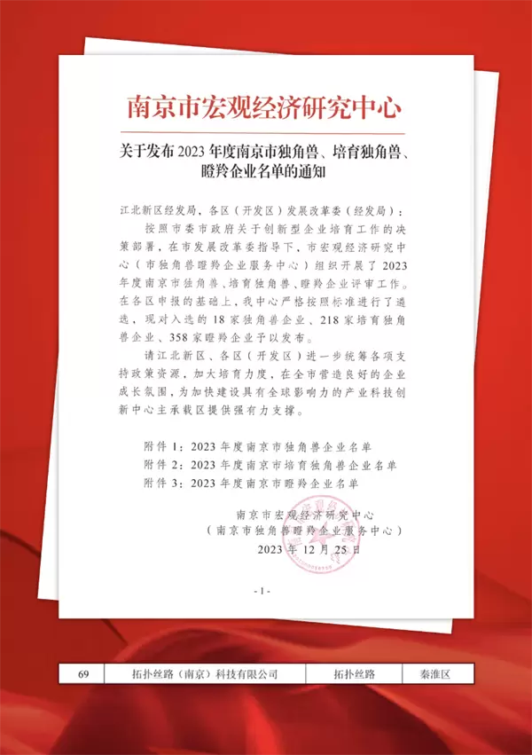 近日,南京市宏观经济研究中心发布2023年度南京市独角兽、培育独角兽和瞪羚企业名单。拓扑丝路作为进出口服务行业数字化的先行者、国家高新技术企业,以行业领先的科技创新能力和快速增长的发展规模,获评“2023年度南京市瞪羚企业”!