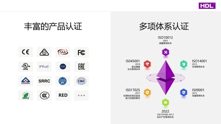 39年来,HDL坚持不懈,创新智造。据统计,HDL研发人员占比高达38%,研发投入占营收的10%以上,该研发投入占比在行业屈指可数。截至2023年12月,HDL累计取得132项认证专利并通过5项ISO体系认证,以及包括CE、UL、CAC、SAA等多项产品认证。