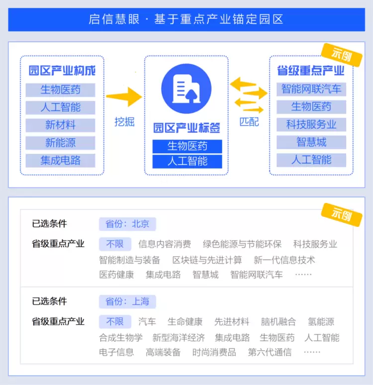 以上海市为例,《上海市战略性新兴产业和先导产业发展“十四五”规划》提出,上海正重点打造以三大产业为核心的“9+X”战略性新兴产业和先导产业发展体系。通过启信数据园区金融解决方案,使用者可快速定位到新能源汽车、人工智能、生物医药、光子芯片与器件等规划中的重点产业,查询维度精确至区级。