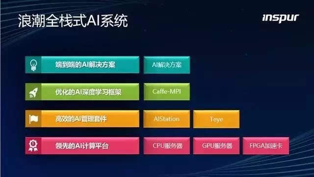 更重要的是,浪潮在AI基础架构领域形成了完整的布局,硬件产品涵盖了机架、塔式以及整机柜所有产品形态,涵盖了GPU、MIC和FPGA等技术方案,开发了AIstation、Teye以及计算框架Caffe-MPI,形成了完整的AI基础架构平台整体方案能力,为浪潮开拓行业AI市场提供了坚实的基础。