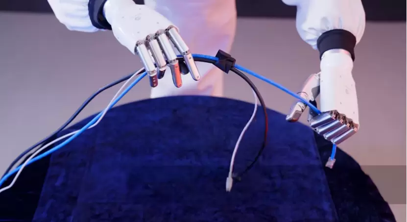 从戴盟的新品发布中可以看到,机器人活动着五指灵巧手,右手拿起线束,左手挑出蓝色网线,瞄准对应接口,稳稳插进。看似一个很简单的动作,但实际上,网线的“水晶头”非上下对称,接口较普通USB更为复杂。人类“插网线”尚且经常出现“对不准”的小bug,而画面中的机器人动作流畅,实属惊艳。