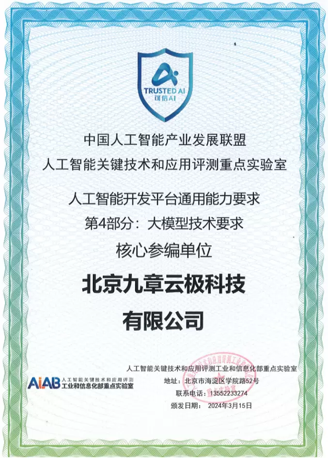 近日,中国信息通信研究院(简称“中国信通院”)重磅发布《人工智能开发平台通用能力要求 第4部分:大模型技术要求》(以下简称“大模型技术要求标准”),九章云极DataCanvas公司依托在大模型领域技术创新和落地应用经验作为核心参编单位全程参与编制。