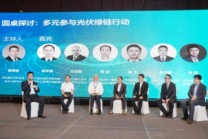 圆桌探讨环节,由阿拉善SEE东吴项目中心秘书长章晓斌担任主持,中国环境科学研究院管理中心首席科学家阳平坚博士、绿色江南方应君主任、阿特斯阳光电力集团产品测试及认证部总监周远、隆基绿能战略管理中心总经理谢天博士、通威股份可持续发展总监朱子涵博士、麦肯锡新能源专家顾问李阳博士担任嘉宾,围绕着“多元参与光伏绿链行动”主题进行了分享与探讨。