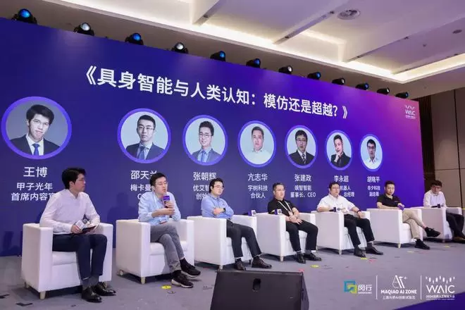 毫无疑问,具身智能正在高速发展,那在此过程中,我们如何确保技术进步与社会责任的平衡?这是一个值得深入探讨的问题。甲子光年首席内容官王博和梅卡曼德CEO邵天兰,优艾智合创始人张朝辉,宇树科技合伙人亢志华,飒智智能董事长、CEO张建政,钛虎机器人创始人、总经理李永超,非夕科技副总裁胡晓平共同进行了一场主题为《具身智能与人类认知:模仿还是超越?》的巅峰对话。