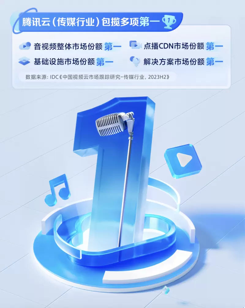 近日,国际数据公司(IDC)发布《中国视频云市场跟踪研究-传媒行业,2023H2》报告。报告显示,腾讯云在传媒行业视频云整体市场份额排名第一,占比达15.7%。此外,腾讯云还在传媒行业视频云基础设施、点播CDN、传媒行业视频云解决方案领域位居第一。