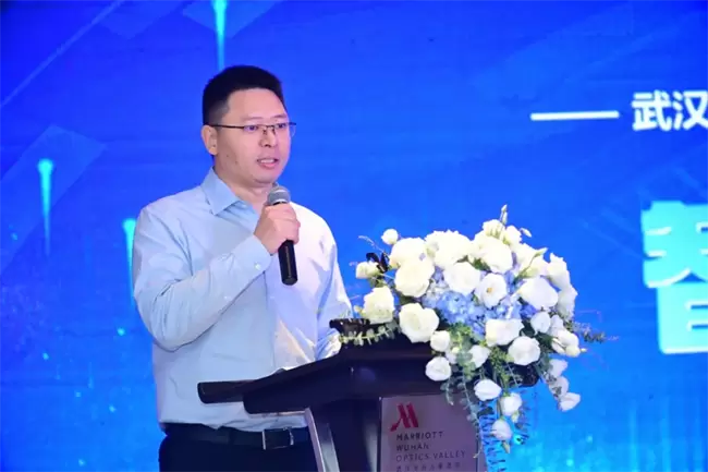 随后,喆塔科技CEO赵文政代表公司致辞,对到场的所有嘉宾表达了最诚挚的欢迎和感谢,并回顾了喆塔科技在半导体AI领域的发展历程与取得的成绩。他表示,喆塔科技始终秉承数据驱动的理念,专注于为客户提供优质高效的半导体AI解决方案。他还特别提到了东湖高新区管委会、光谷金控以及所有支持喆塔科技的单位和个人,表示公司能够在武汉这片创新沃土上扎根并服务于整个半导体产业链,离不开他们的关注和支持。