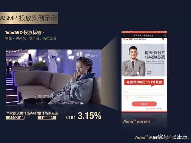 例如,英语在线培训机构TutorABC在使用ASMP投放广告时,选择了明星+讲英文、境外游、品质生活等情景进行批量化精准投放,在完成对视频调性与广告品牌的匹配度时,激发用户在特定的视频场景内产生情景共鸣,有效提升转化率。