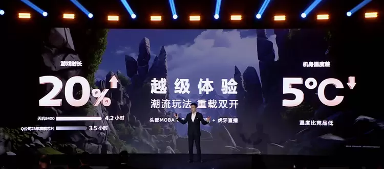 更关键的是,这种GPU表现并非停留在理论测试上,天玑 8400在实际游戏场景中更是展现出了“同级无敌、越级体验”的实力。在高负载、多任务并行的情况下,比如后台开着QQ、虎牙直播,同时用120帧模式打头部MOBA游戏,天玑 8400 对比友商旗舰芯片,不仅游戏时长更持久,机身温度也低了足足 5°C。
