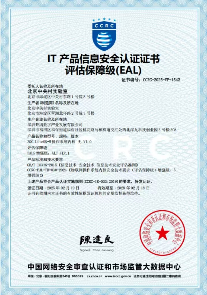 CCRC作为国家信息安全领域权威认证机构,严格依据《信息技术 安全技术 信息技术安全评估准则》、《物联网操作系统内核安全技术要求(评估保障级4增强级、5增强级)》等国家标准,对深开鸿深度增强的LiteOS-M操作系统内核展开全方位安全评估。评估过程涵盖了产品设计开发、配置管理、交付、测试、脆弱性评估等关键环节。此次认证不仅标志着深开鸿在物联网操作系统内核安全领域达到EAL5+级别标准,更凸显其基于开源生态进行自主可控技术升级的产业实践价值。