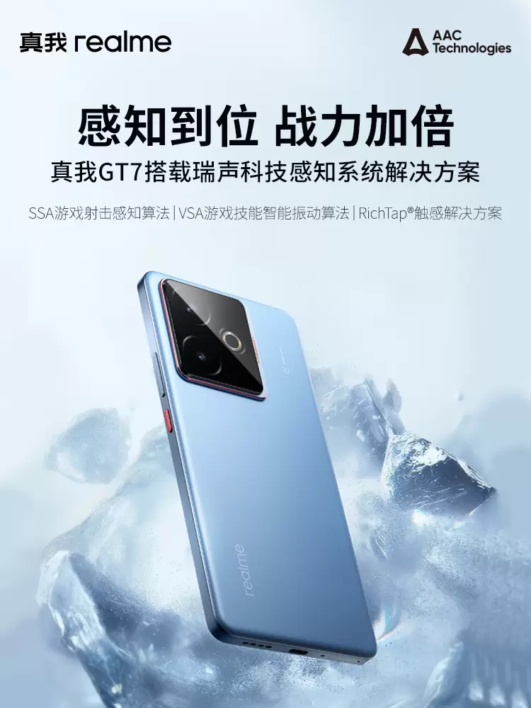 4月23日,真我GT7新品正式发布。新机搭载瑞声科技感知系统解决方案,其中AAC 「AI超感外挂」从声音、触感方面为用户打造沉浸感知体验。