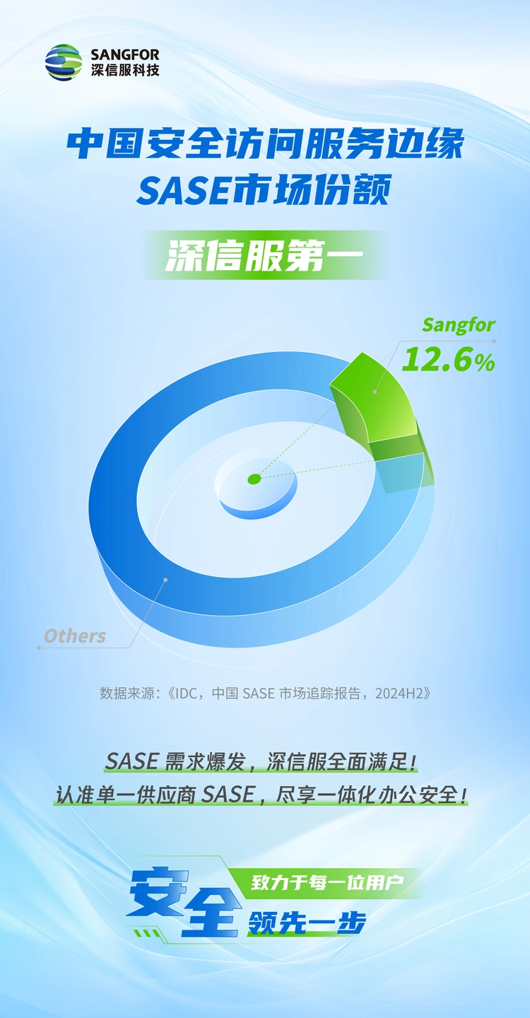 近日,国际数据公司(IDC)发布《中国SASE市场追踪报告,2024H2》。深信服科技凭借全面的SASE解决方案能力,获得市场广泛认可,并以12.6%市场份额位居国内第一。