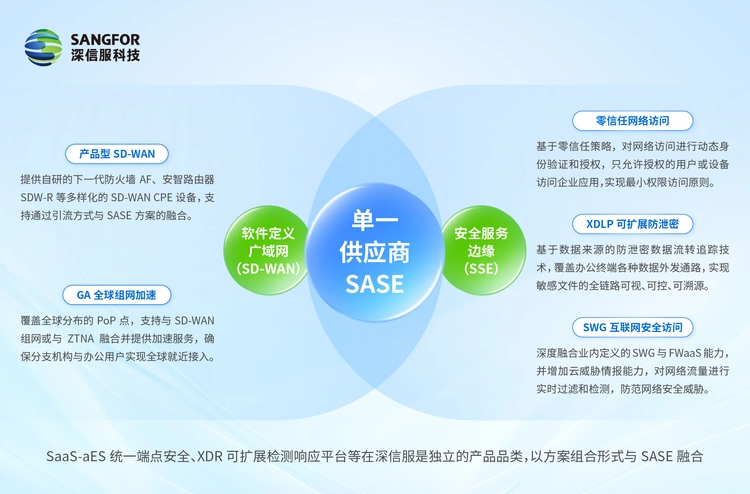 深信服SASE采用全云原生架构,深度集成SD-WAN与安全产品栈能力(零信任网络访问、XDLP可扩展防泄密、SWG互联网安全访问等),通过全球分布的PoP点,为用户提供“单一供应商SASE”的组网与安全服务,满足用户随时随地安全办公的需求。