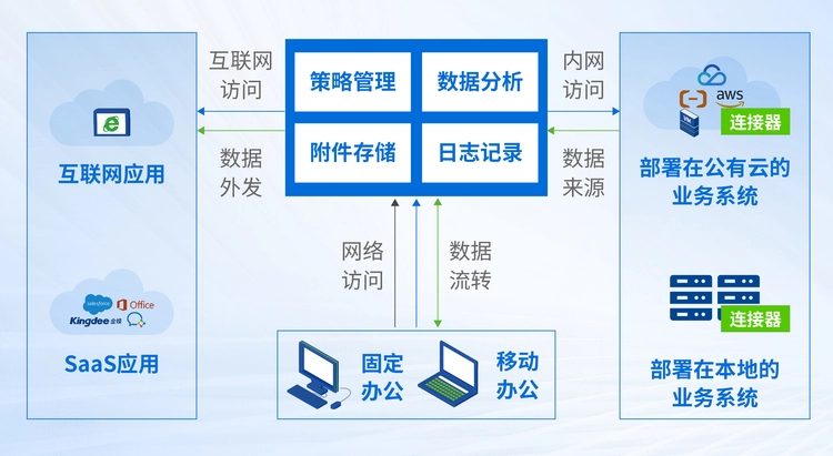 对于中小企业用户,推荐采用轻量化的纯SASE线上交付模式「线上零信任ZTNA+线上SWG+线上XDLP」——无需硬件部署,只需在数据中心部署一个连接器软件即可完成交付。用户可以选择单品订阅后平滑升级,或者一次性云端订阅多种能力。而纯本地化部署模式(包括控制面和分析中心)更适合金融行业或大型央国企用户。