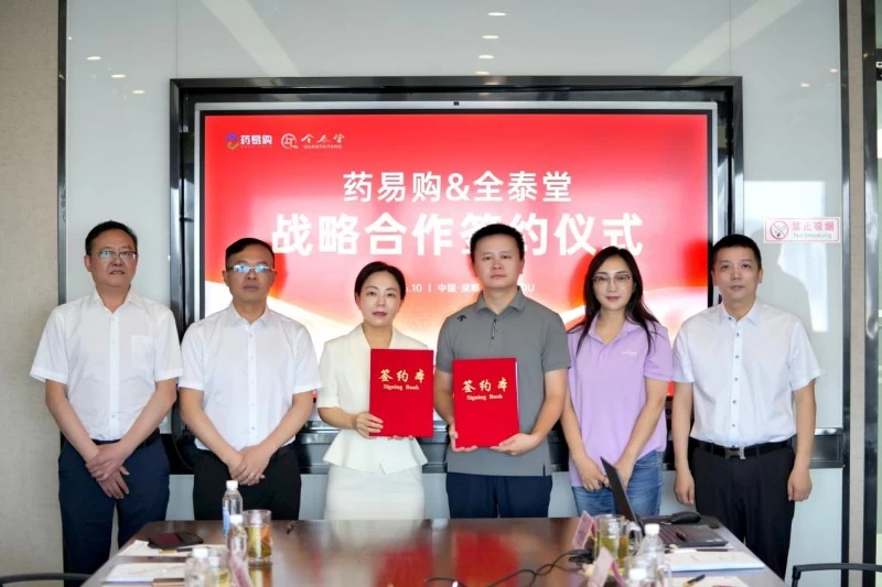 2025年6月10日,全泰堂集团有限公司董事长韩辉军一行莅临药易购进行商务洽谈,并正式签署战略合作协议,药易购将携手全泰堂成立“合纵全泰堂“共同探索合作新模式,共同经营中华老字号,以进一步弘扬中华民族品牌价值,推动大健康与中医药文化发展。药易购董事长李燕飞、总裁陈顺军等共同出席。