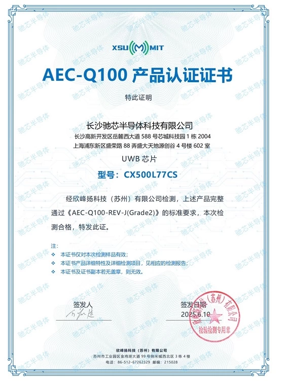 在物联网技术快速发展的当下,精准定位与数据传输技术成为万物互联的关键。驰芯半导体作为行业先锋,其UWB芯片CX500通过了AEC-Q100(Grade2)车规认证,标志着该芯片在汽车电子领域具备卓越的可靠性和稳定性。该认证涵盖高温储存、温度循环、湿度测试、机械冲击和振动等多项严苛测试,适用于-40℃到+105℃的工作温度范围,为汽车智能化发展提供了坚实基础。