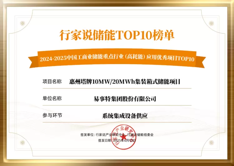 喜报!易事特集团荣登2024-2025工商业储能项目TOP10榜单