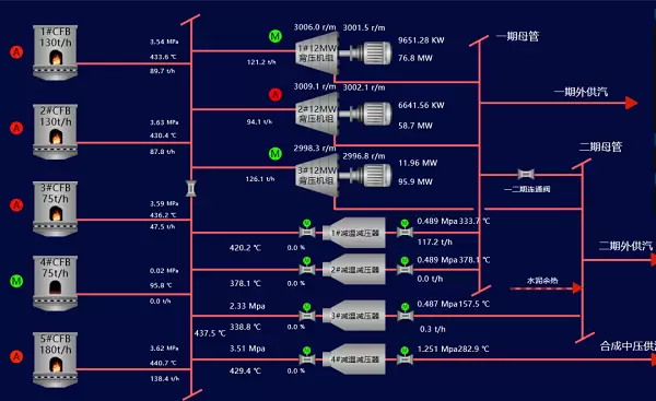 在热电供应方面,蒙维科技动力厂构建了庞大且复杂的热电生产系统,包括“2×130t/h中温中压循环流化床锅炉+2×75t/h中温中压循环流化床锅炉+1×180t/h中温中压循环流化床锅炉+3×12MW中温中压背压式汽轮发电机组+4台双减+供汽管网”,肩负着为生产基地供应稳定电力和高品质热能的重要使命。 然而,传统热电系统“非线性、强耦合、大延迟、多时变”的复杂运行特性,给稳定高效的能源供应带来诸多难题。随着能源行业数字化转型步伐加快,蒙维科技动力厂迫切需要借助智能化手段,提升生产效率、降低能耗并增强运行稳定性。为积极响应数字中国战略,蒙维科技选择与全应科技携手,共同开启热电系统智能化升级的征程。
