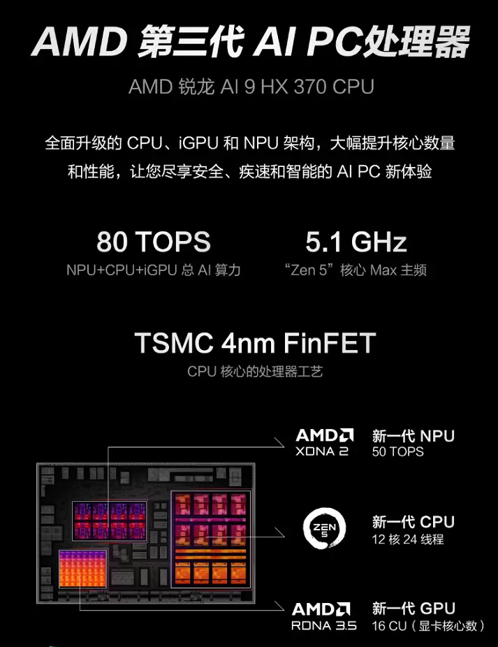 ROG幻14 Air 2025搭载第三代 AMD AI+ PC 处理器--AMD 锐龙 AI 9 HX 370 移动处理器,CPU、GPU 和 NPU 架构全面升级,无论您是进行多任务处理、享受沉浸式游戏还是专业内容创作,它都能为您提供强大的AI处理能力。12 个高性能核心 24 线程,单核 Max 主频高达 5.1GHz,核心数较上一代产品提升50%,多任务处理和内容创作都更快更高效。