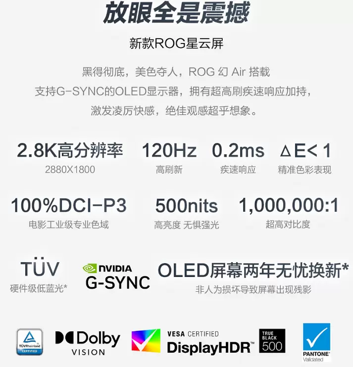 视觉体验上,ROG幻14 Air采用14英寸2.5K 120Hz ROG星云屏,高素质OLED面板可呈现1000000:1超高对比度画面。100% DCI-P3色域覆盖,出厂校色平均△E<1,支持四种专业色域切换,另有潘通色彩认证、杜比视界等多项权威认证加持,屏幕素质与呈现效果均属顶尖。