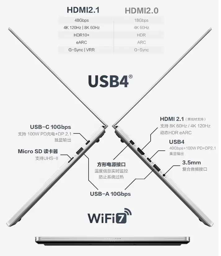 接口方面,ROG幻14 Air 2025配备2个USB-A 10Gbps、1个USB4 40Gbps、1个USB-C 10Gbps接口,同时双C口均支持DP 2.1协议和PD充电,另有HDMI 2.1FRL、3.5mm音频接口、Micro SD卡槽等,扩展性全能。