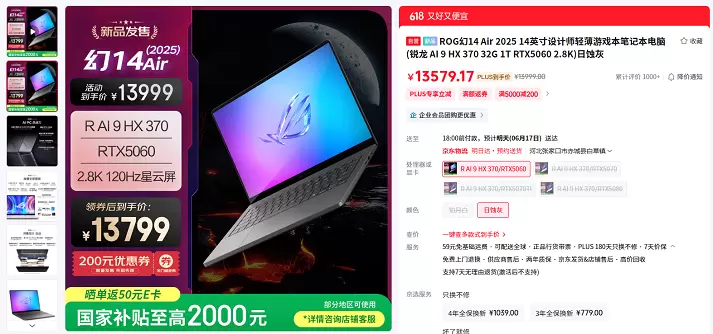 618年中大促正当时,叠加国家补贴政策,正是升级专业装备的好时机。14英寸专业性能轻薄本ROG幻14 Air 2025实现了轻薄便携与高性能的平衡,能胜任高强度创作与生产力任务。其搭载第三代 AMD AI PC 处理器,支持本地AI应用,并有RTX 5060笔记本电脑GPU输出图形性能,无惧高负载渲染,性能实力强悍。眼下618期间,ROG幻14 Air 2025叠加国补(部分地区)和满减优惠后到手11799元,值得关注。
