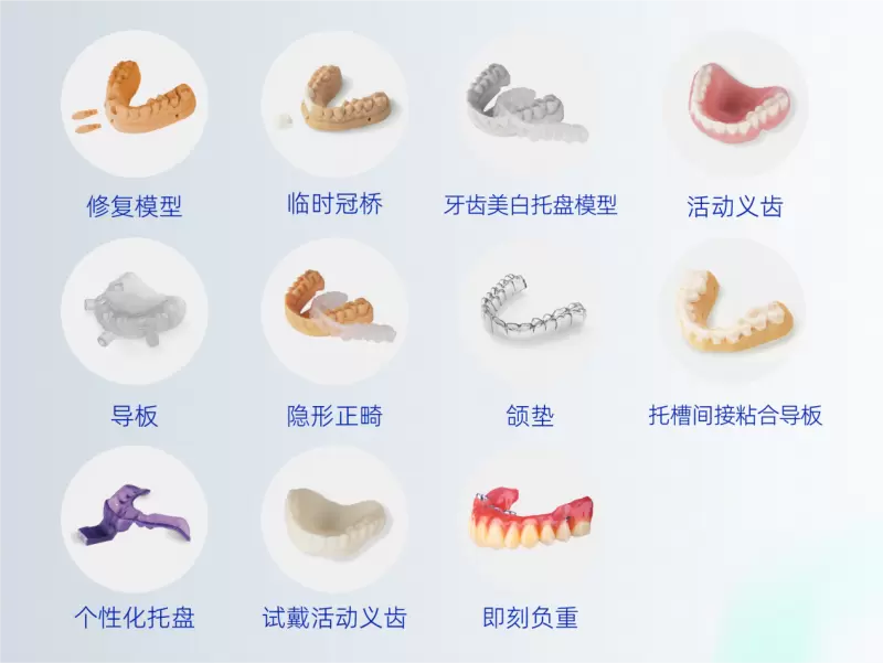 Edge mini可全面支持口腔临床各类打印需求,包括固定修复的冠桥模型、活动修复的个性化托盘、正畸咬合垫以及种植导板等,其丰富的适配材料经过严格测试,能够满足诊所多样化的椅旁即时生产需求。