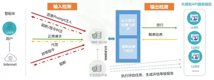 针对提示注入、越狱攻击等恶意输入,产品提供专项安全检测机制,强化大模型自身的抗攻击能力与鲁棒性,确保模型在复杂环境下的稳定性和可靠性。