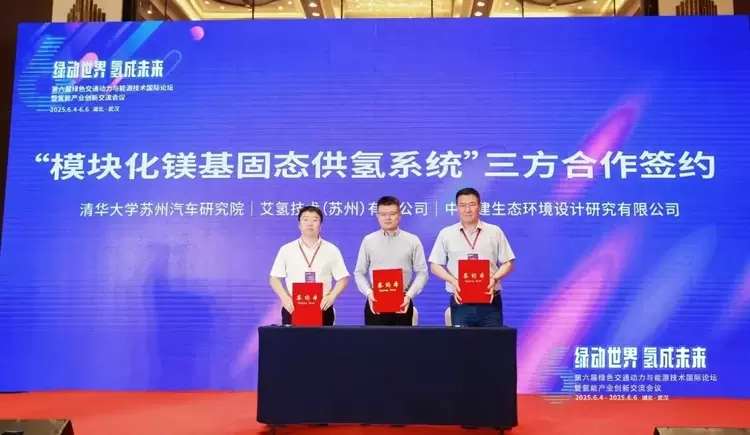 为进一步推动固态储氢技术创新与产业化应用,清华大学苏州汽车院与艾氢技术(苏州)有限公司、中电建生态环境设计研究有限公司在论坛现场正式签署战略合作协议。三方将围绕“模块化镁基固态供氢系统”开展深度合作,实现技术突破与产业落地,共同推动中国氢能产业的高质量发展,助力国家“双碳”目标实现。