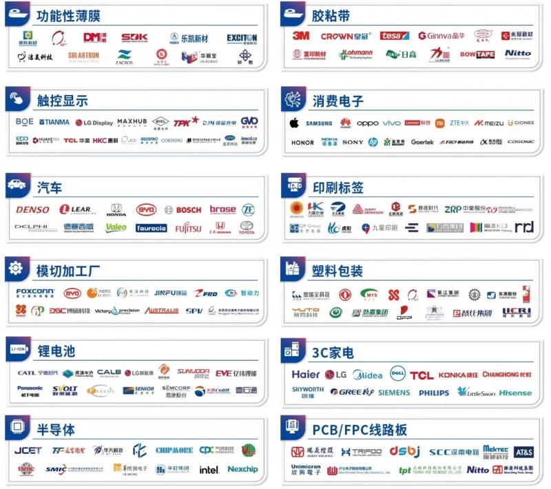 触控显示、消费电子、塑料包装、印刷标签、涂布模切加工、3C家电、汽车、锂电、半导体、PCB/FPC线路板、光伏、建筑装饰、医疗等薄膜胶带下游行业