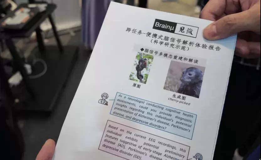 智源大会现场展示环节中,体验者佩戴脑电信号采集设备观看一组动物图片,Brainμ模型随后对采集的脑电信号进行解析并生成对应的视觉图像,同时出具脑疾病诊断报告,初步预测体验者是否存在患精神类疾病的可能,该项技术为未来脑疾病诊断辅助打开了新的可能。