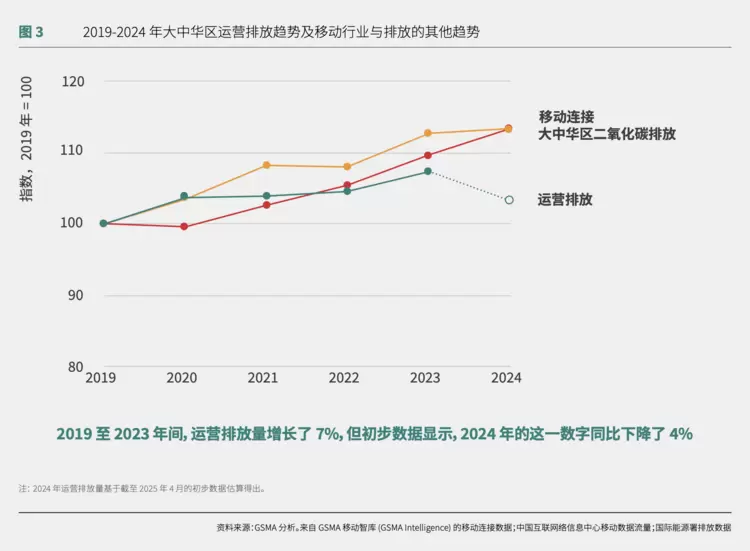 6月18日,GSMA发布《移动净零排放:大中华区》报告,其中显示尽管自2019年以来中国移动数据流量增长近四倍,但得益于能源效率提升和可再生能源使用比例增加,中国移动运营商在2024年首次实现运营碳排放同比下降。