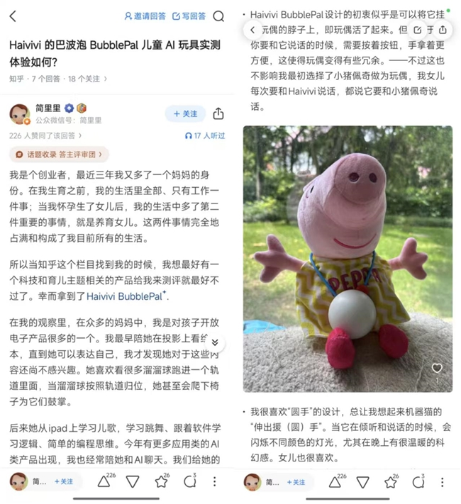 同时,BOSS的测评也结合了专业领域和消费者双重视角。简单心理创始人兼CEO简里里,以心理学从业者和两岁孩子母亲的双重身份,用半个月时间全面记录了女儿与Haivivi巴波泡儿童AI玩具的互动过程。这种专业视角与生活场景的深度融合,使测评内容既具备学术严谨性,又保持着家庭日常的烟火气。答主的测评也极富人文关怀和前瞻视角,答主JINN在测评中,重点关注了AI玩具的数据安全和隐私保护,这也和当前AI应用中的隐私标准问题和媒体关切形成映照。
