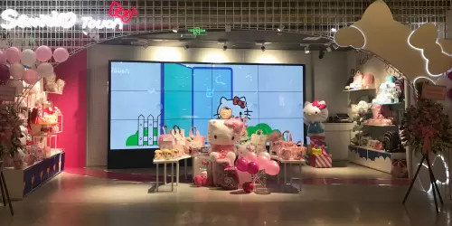 2018年9月,在上海,静安大悦城6楼,一家全新的Hello Kitty主题商店悄然开业。相比上海的其它Hello Kitty礼品商店,静安大悦城的这家,店面不大,商品和陈列看似也并无特别之处。唯一显目的特征,就是迎面墙上一个始终循环播放的巨幅大屏,占据了几乎整个墙面。